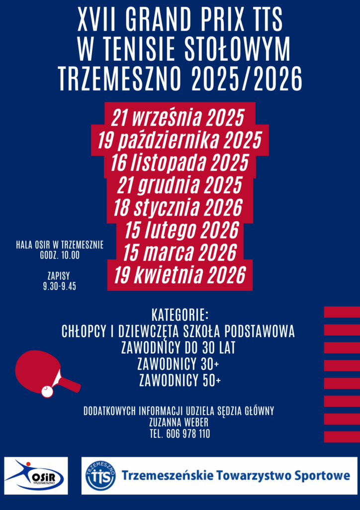 Już w przyszłą niedzielę, 21 września, rozpoczynamy cykl turniejów Grand Prix TTS Trzemeszno w tenisie stołowym. Serdecznie zapraszamy!